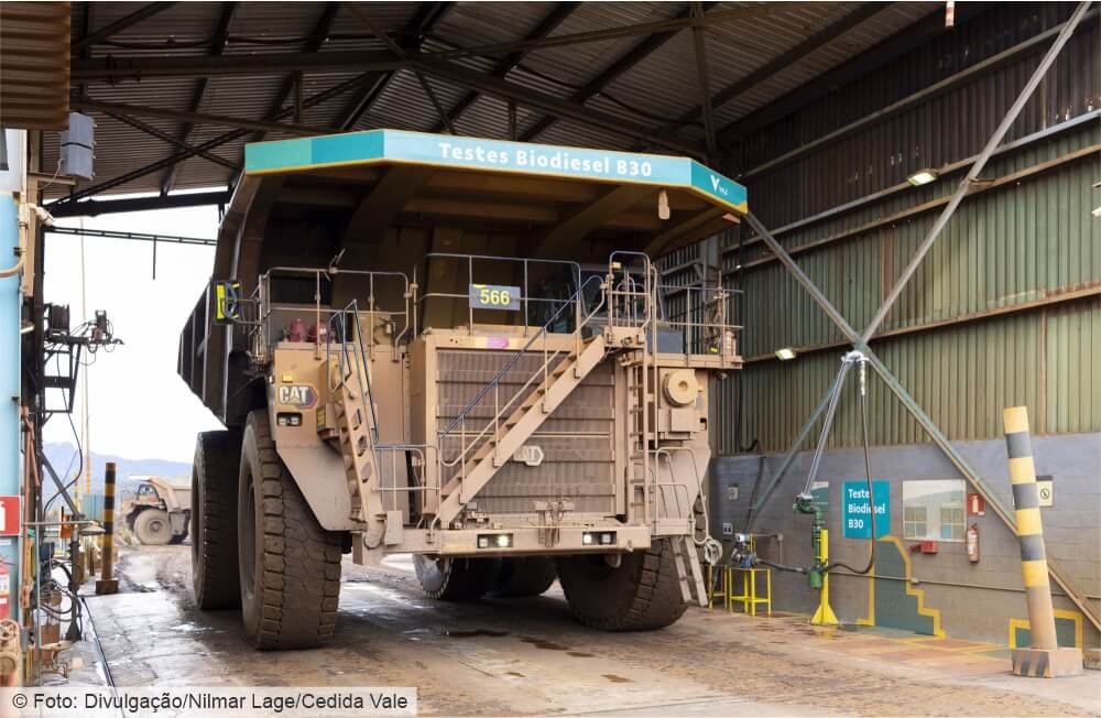 A empresa busca viabilizar o aumento da mistura de biodiesel nos caminhões fora de estrada dos atuais 15%, estabelecidos pela legislação brasileira, para um percentual de 30 a 50%. Testes em bancada realizados desde 2023 demonstraram que a alternativa é promissora, o que levou a Vale em novembro a avançar para os testes em campo no Complexo de Mariana, em Minas Gerais, com veículos com capacidade de 190 toneladas.